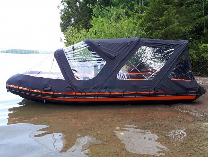 Боковины тента оснащены капитанскими окнами и могут быть полностью подняты, что создает открытое пространство вокруг лодки и обеспечивает легкий доступ к бортовой части. Это особенно удобно при стоянии на причале или для загрузки и разгрузки оборудования.